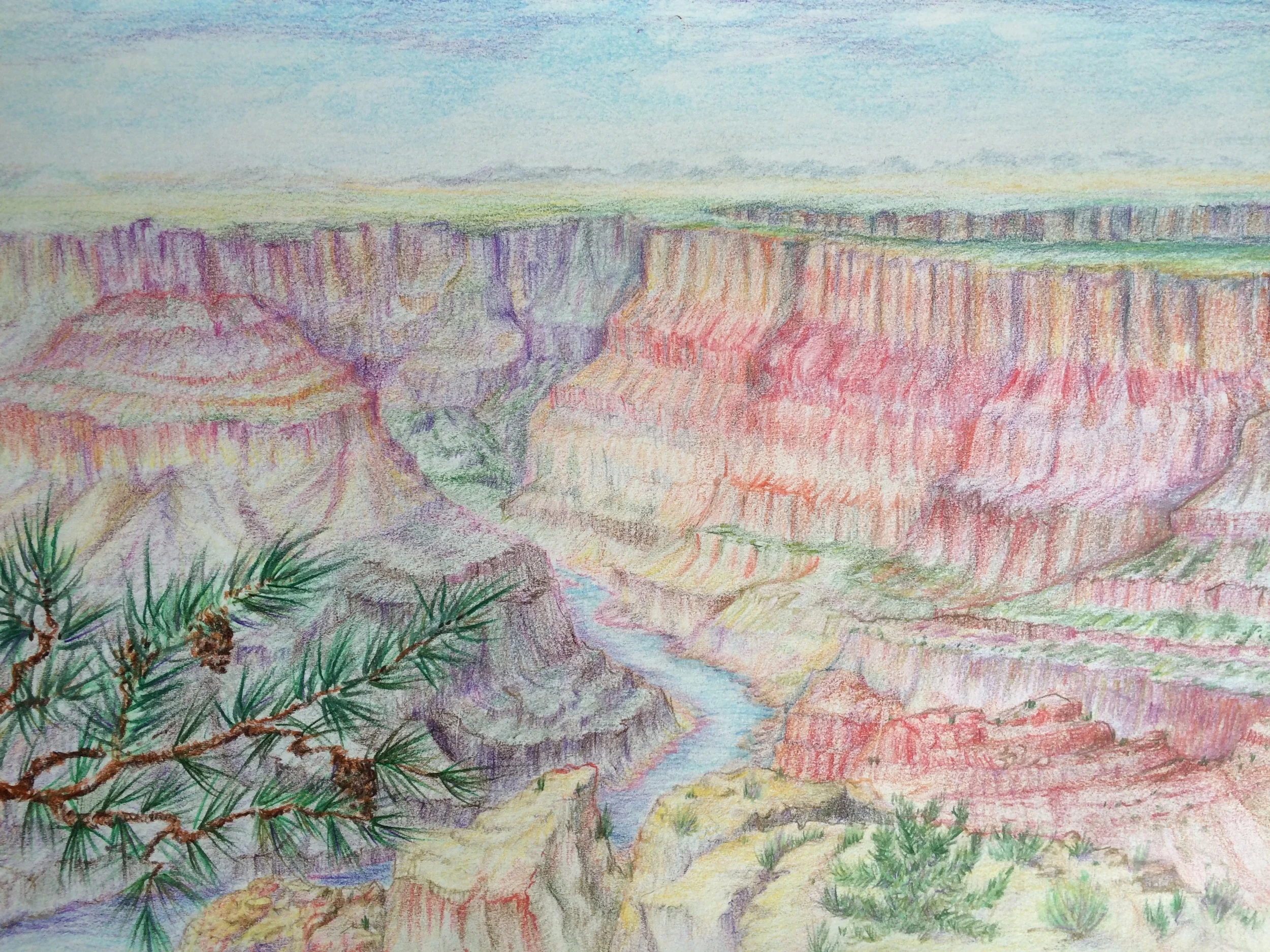 The last drawing on this page is my colored pencil interpretation of a beautiful painting by the contemporary American artist Glenn Renell. I was intrigued by his idea of making a landscape within the context of a rainbow or color wheel. Look carefully. The top starts with the color blue-violet and moves cleverly down through blue, red-violet, red, orange, yellow, green, blue and back to purple. Very clever I think!